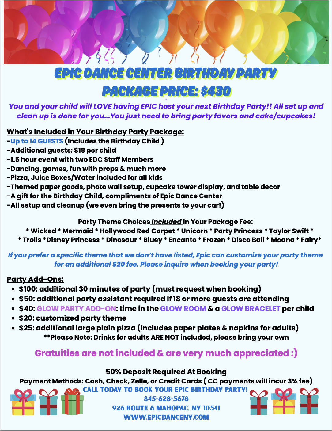 If you prefer a specific theme that we don’t have listed, Epic can customize your party theme for an additional $20 fee. Please inquire when booking your party!