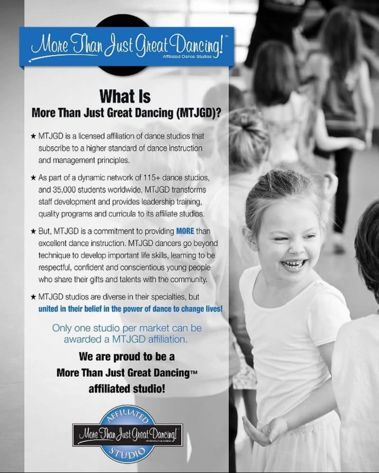 As a certified MTJGD studio, we’re part of a national network of high-quality dance schools dedicated to excellence in both dance education and life skill development. MTJGD studios go beyond technique to help dancers grow into confident, respectful, and community-minded individuals. This affiliation represents our commitment to exceptional training, leadership, and a positive, empowering studio culture.